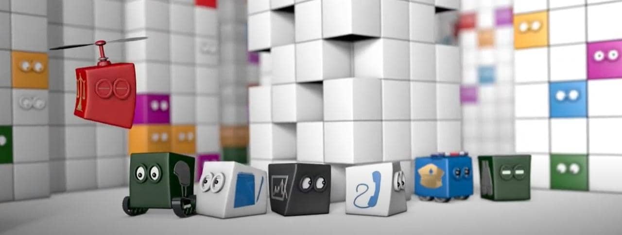 (Een grijs poppetje vliegt weg. Een kantoorgang.)